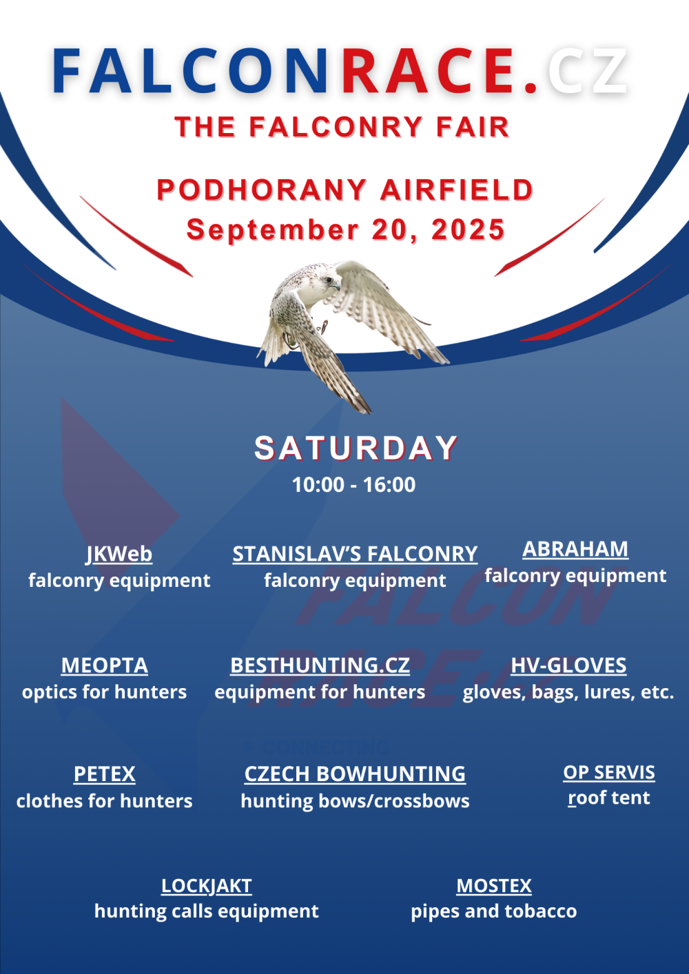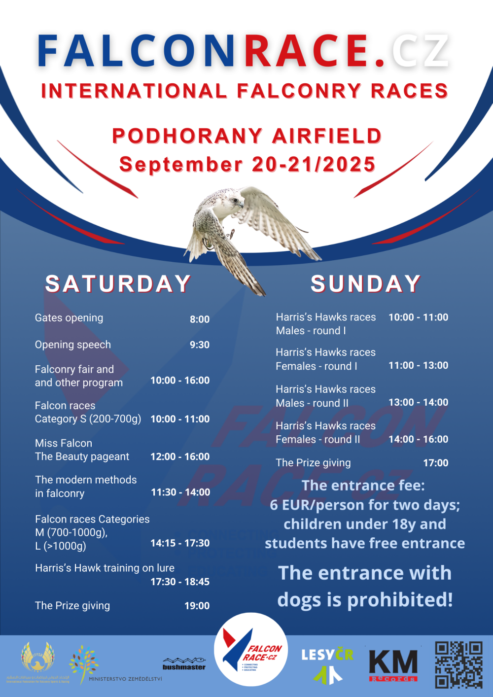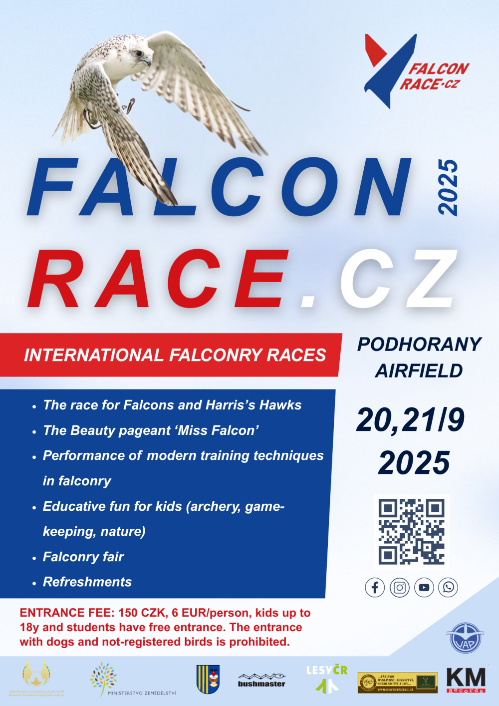 The competitions are followed by falconry hunts FALCONRACE HUNTING DAYS from 22/09 to 23/09/2025 with the possibility of fee hunting of wild hares in hunting grounds near Brno. A falconer competing with a falcon may also take part in hunting hare game with a shortwings, except eagles.