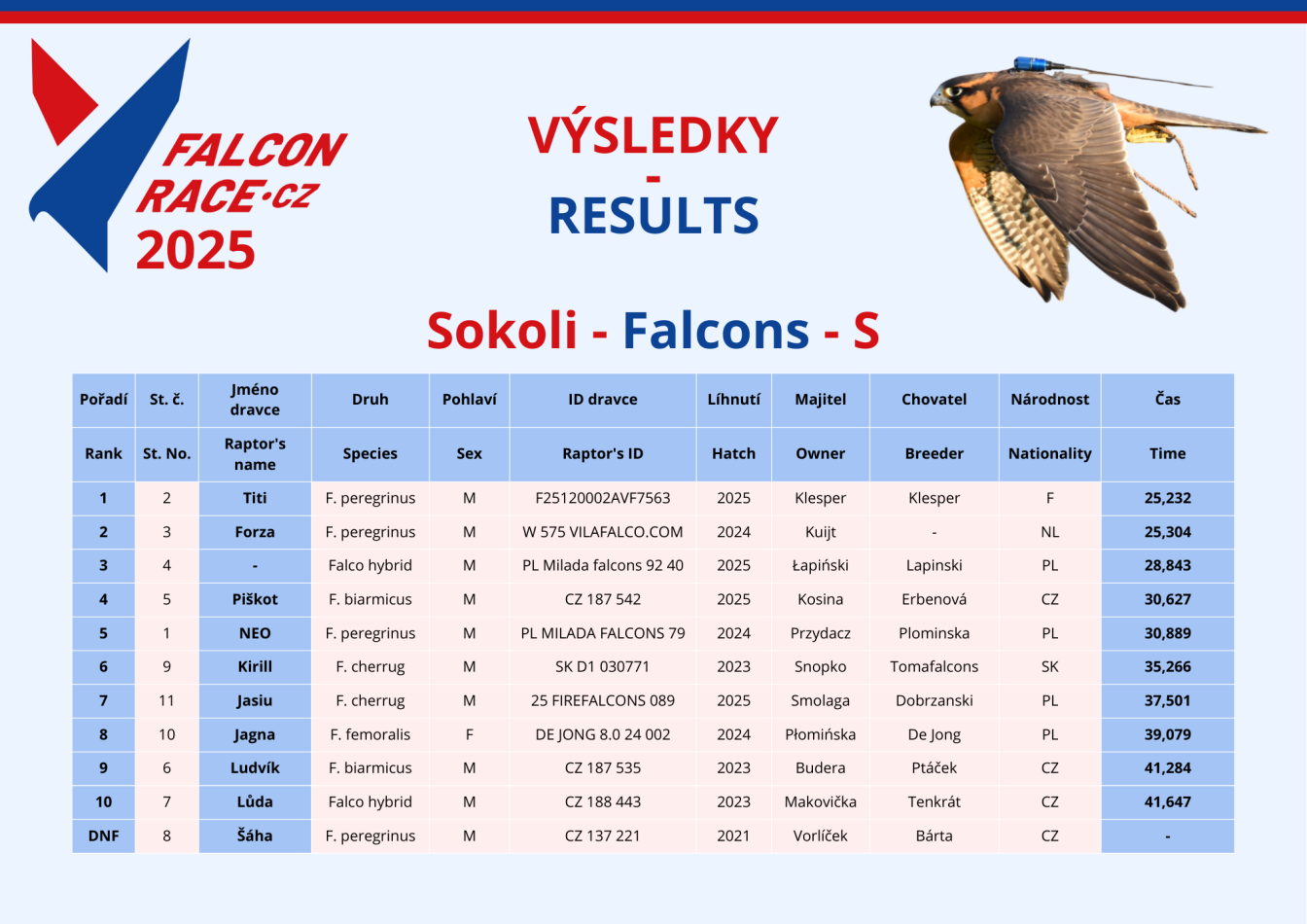 - The account number for payment of registration fees is CZ63 2010 0000 0025 0298 7537, BIC/SWIFT: FIOBCZPPXXX (download payment details in PDF). The registration fee is 45 euros for each bird of prey entered in the race. Please pay the total amount to the above account within 48 hours of submitting the registration form. When paying online, please include your surname and phone number with international dialling code (e.g. 00420 777 111 222 333) in the note.