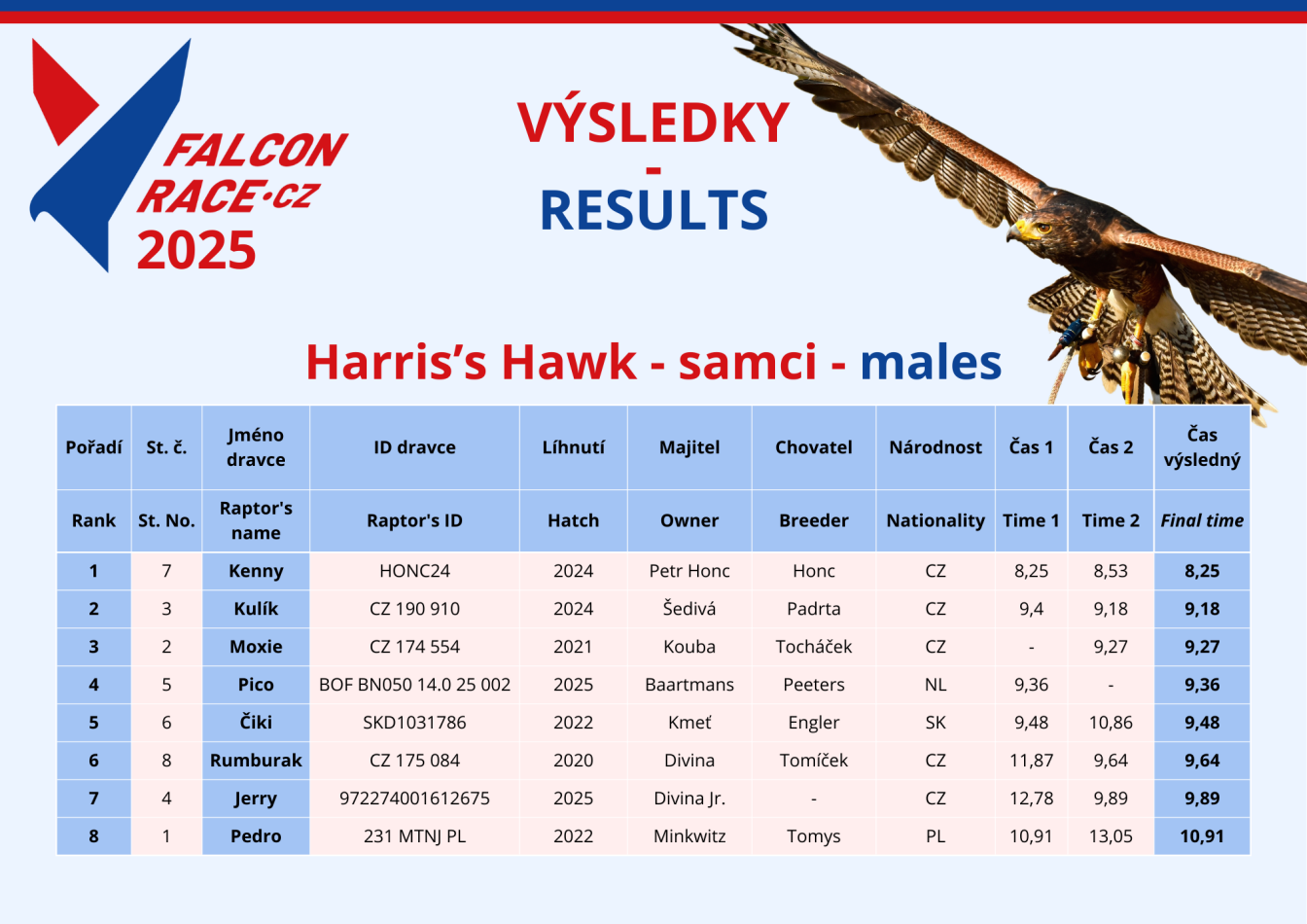 15) The winner is the falcon with the lowest time score.